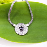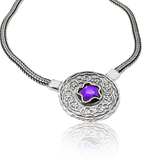 Imagine you are an ancient Greek goddess adorned with luscious jewels. This deep purple amethyst pendant is heavenly in all its glory. One of our favorite pieces! Intricate ancient floral silver work accents this radiant gem.
