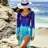 This tie dye cover up has us truly realizing how much we need an escape this summer! That print is so much fun and that fit! Honey! That gold sequin detail and sheer chiffon give this coverup the sexiest vibe! The side slits are super sassy too! This maxi cover-up features a v-neck, long sleeves, a gold sequin detail, and a tie dye print.