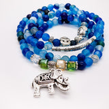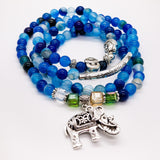 Whimsical and vivid blue agate wrap around wrist mala, with Ganesha, and Buddah accent beads.