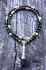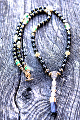 This formidable mala is an architectural masterpiece of energetic defense and spiritual sovereignty. It anchors the wearer with a "Triple-Shield" of Black Onyx, Black Tourmaline, and Smoky Quartz, creating an impenetrable foundation of physical stamina and emotional self-mastery. This grounding force is elevated by the mystical "Liquid Light" of Selenite and the iridescent protection of Labradorite, which shield the aura while awakening innate magical abilities and psychic vision. Complemented by the noble, calming influence of Asian Jade, the mala ensures that power is wielded with wisdom and peace. Bound by both Gold and Silver, it harmonizes the Sun’s triumphant success with the Moon’s intuitive reflection, transforming the wearer into a balanced master of their own destiny.