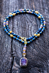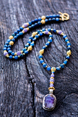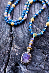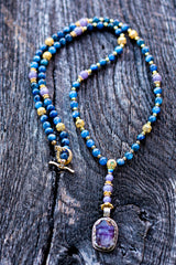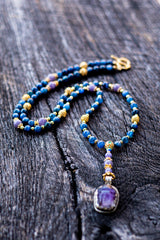 This extraordinary mala is a bridge to the higher realms, meticulously crafted to facilitate spiritual evolution and the expansion of the mind. At its pinnacle sits a Hand-Carved Amethyst Buddha pendant, embodying the transmutation of lower energies into spiritual wisdom and tranquility. This is paired with the rare, high-vibrational frequency of Natural Blue Tanzanite and the instant alignment of Blue Kyanite, a stone that never requires clearing. Bathed in the radiant, solar-charged energy of 18k and 22k Gold, this mala acts as a psychic antenna, sharpening intuition and fostering a profound connection to the divine.