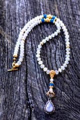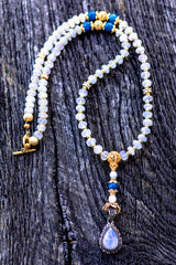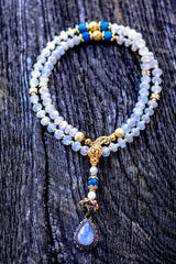 This ethereal mala is a beacon of high-vibrational "Liquid Light," designed to bridge the gap between the conscious mind and the infinite reaches of the soul. At its heart lies a Double Blue Moonstone Pendant set in Sterling Silver, a rare and potent focal point that captures the reflective mystery of the lunar cycle. Anchored by Gem-Grade Blue Moonstone and the visionary power of Natural Blue Apatite, this piece creates a profound energetic circuit for spiritual awakening. By harmonizing the cooling, feminine intuition of Silver with the triumphant, solar manifestation of 18k and 22k Gold, this talisman empowers the wearer to navigate their spiritual evolution with grace, clarity, and protected confidence.