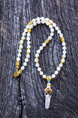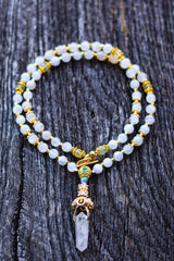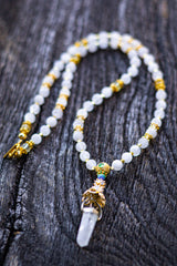 This masterful mid-length mala is designed to rest intentionally above the heart, acting as a high-frequency transmitter for the upper chakras. It features a Double Terminated Clear Quartz pendant, a powerful "Stone of Power" that serves as a multi-directional bridge for spiritual energy. This is paired with the rare, ethereal glow of Double Blue Moonstone and the sun-drenched vitality of Citrine. By marrying the cooling, intuitive depths of the moon with the triumphant manifestation power of 18k and 22k Gold, this piece creates a perfect alchemical balance, allowing the wearer to manifest their highest soul purpose with crystalline clarity.