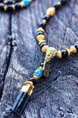 Anchored by the sacred Hamsa Hand—an ancient symbol of divine protection against the Evil Eye—this powerful mala channels celestial safeguarding alongside Earth's oldest wisdom. At its center pulses Nuummite, the 3-billion-year-old "Sorcerer's Stone" that unlocks psychic abilities and connects you to primordial Earth energies. This extraordinary combination is fortified by a triple-layer protection system: Black Tourmaline deflects external negativity, Black Onyx strengthens emotional resilience, and Pyrite creates an energetic shield while attracting abundance. Apatite enhances the entire system, providing mental clarity and access to Akashic wisdom.
