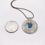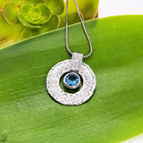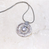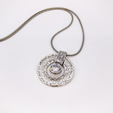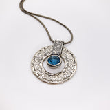 NETANYA necklace is one of our most popular pieces. She is exciting and makes a real statement. Hand etched floral design inspired by Ancient Roma with shimmering topaz center stone.