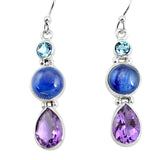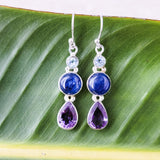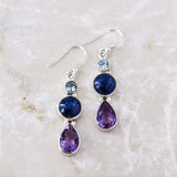Make in RANE with these stunning gemstone dangle earrings. Perfect earrings for a night out, or a casual day out having fun. Shimmering purple amethyst rain drops with kyanite and blue topaz gemstones.
