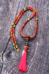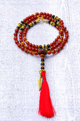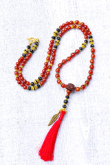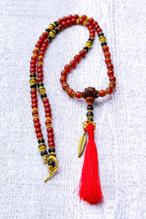 Red Carnelian, Black Spinel, Black Tourmaline, Swarovski Crystal beads, Hand carved Sandalwood Lotus Guru, Brass Feather pendant, 18k and 22k Gold