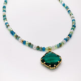 Materials: Multicolor crystal beads with green emerald crystal pendant wrapped in gold.