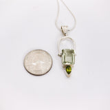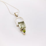 Seductive and mysterious Green Amethyst. This stone will encourage you to be your unique and fabulous self. Made with a shimmering piece of Green Amethyst with Peridot accent, set in Sterling Silver.