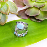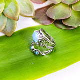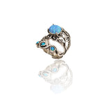 Whimsical silver wrap design ring with vibrant blue opal accent stones.