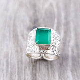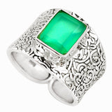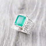 Vibrant green chalcedony positively glowing with the energy of life. This stunning ring conjures dreams of Southern India. The handcrafted silverwork is absolutely beautiful.